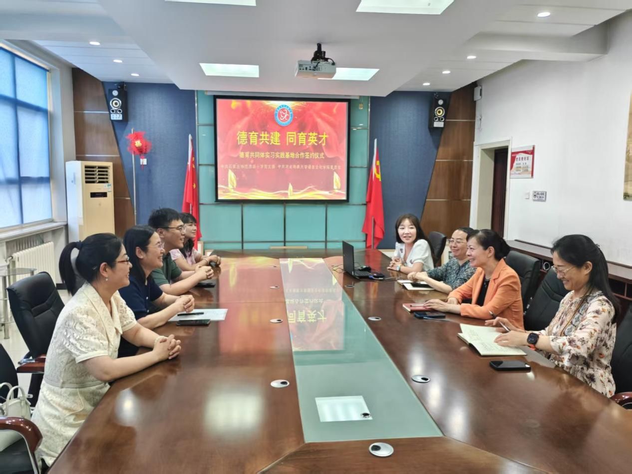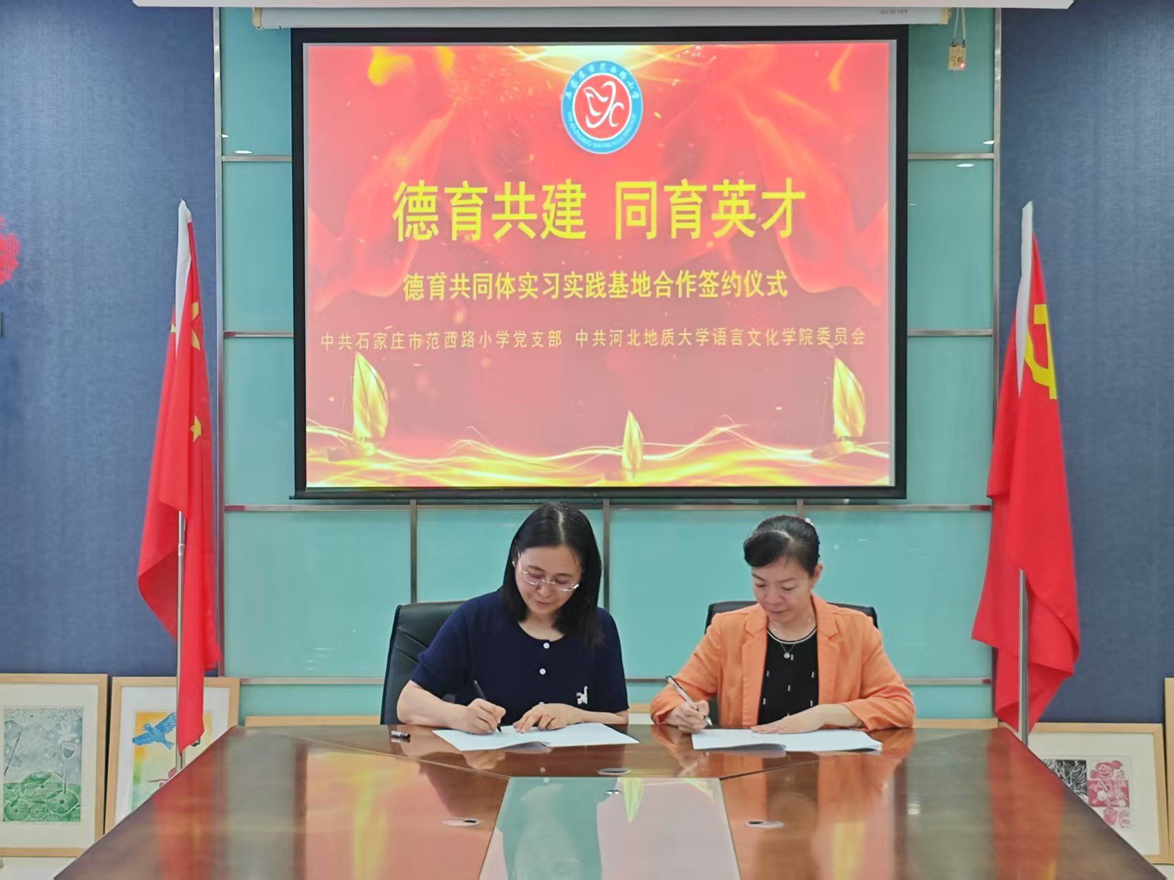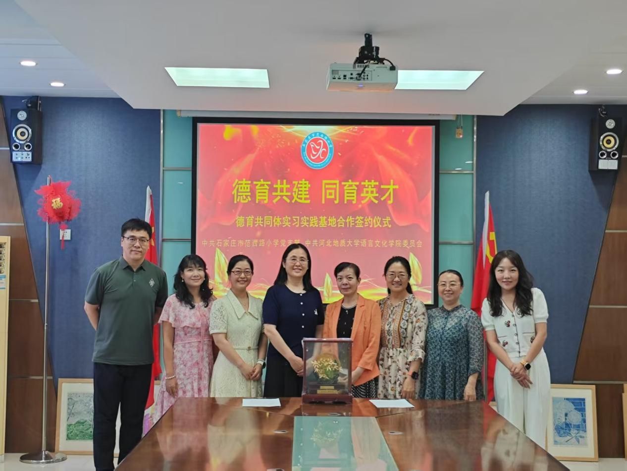6月19日下午,河北地质大学语言文化学院党委书记宋朝霞、党委副书记杨旭辉、教师党支部书记李云华、郭思斯一行四人,到全国文明校园石家庄市范西路小学进行走访。范西路小学校长杜萱、党委副书记邸英宣、副校长龚晓玲、教育主任裴蕾热情接待。双方就在实习实践、党建联建等方面开展合作进行了深入交流,并正式签订了合作协议。
