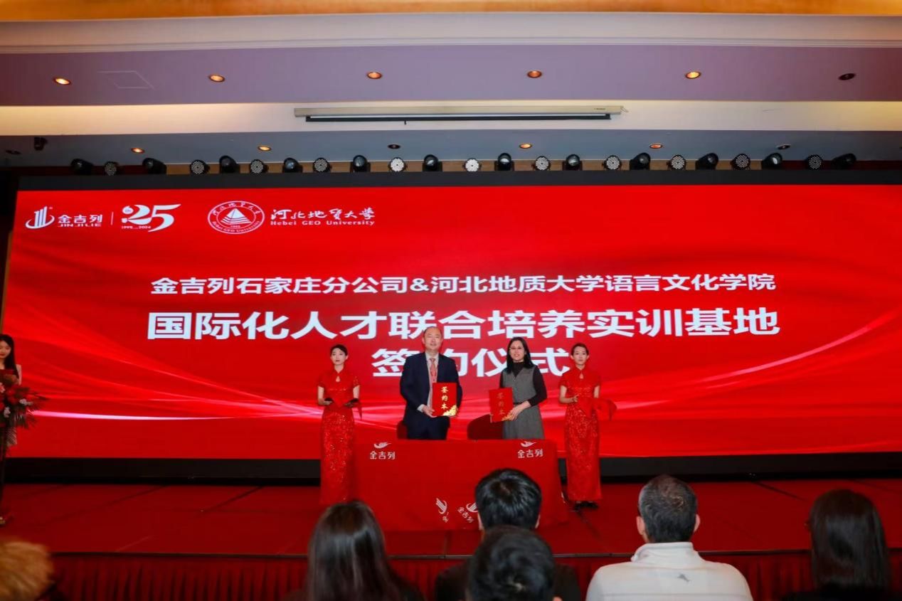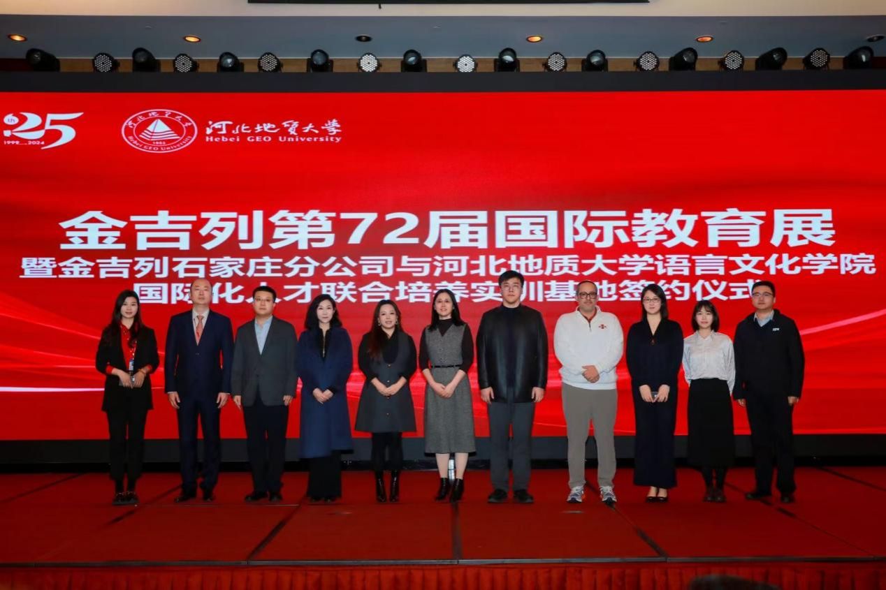 2024年11月16日,我校语言文化学院与金吉列石家庄分公司在石家庄世贸广场酒店签署合作协议,共同成立国际化人才联合培养实训基地,院党委书记宋朝霞、副书记杨旭辉、金吉列国际教育集团首席运营官牛雅卓、高级副总裁王宁、石家庄分公司总经理房晓敏等出席签约仪式。
