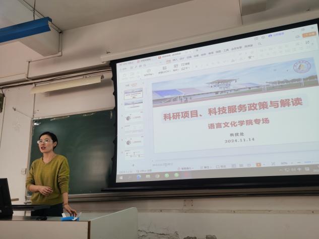 2024年11月14日下午,语言文化学院特别邀请到校科技处项目管理科科长李百华,为全学院教师做了一场题为“科研项目、科研服务政策与解读”的说明会。