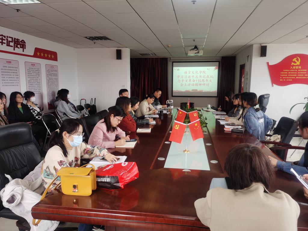 10月9日上午,语言文化学院党委全体委员(党委书记林琳、党委副书记杨旭辉、副院长安尚勇和各支部书记)及师生党员代表在学院会议室集中收看了辛亥革命110周年大会直播。大会直播结束后,全体人员就习近平总书记在大会上的重要讲话精神进行了学习研讨。