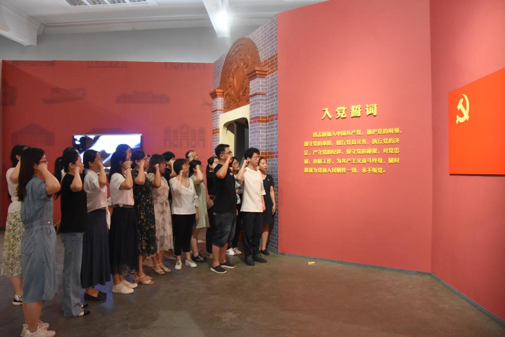布展内容全部观看完毕后,学院党员重温了入党誓词,在展馆面对党旗齐声庄严宣誓。