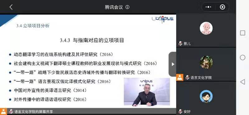 1月18日上午,学院通过视频直播形式第一次进行了本年度“研语致见”线上讲座。此次讲座由北京外国语大学张威教授主讲,主题为《人文社科项目选题战略分析》,学院老师和部分学生一同聆听了讲座,讲座由语言文化学院副院长安尚勇主持。
