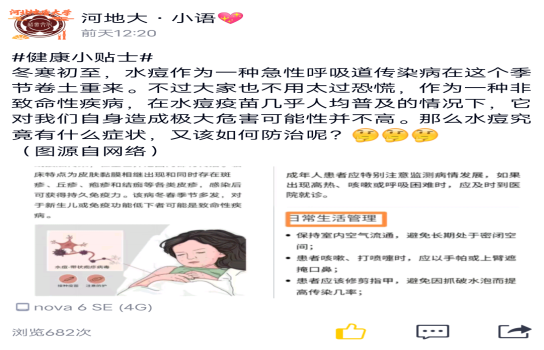 秋冬交替之际,呼吸道传染病将迎来高发“流感+新冠”成为一个严肃的问题,为继续增强学生疫情防控和预防疾病的意识,我院通过QQ公众号“河地大小语”对新冠肺炎个人防护措施进行了线上宣传,也对水痘、诺如病毒等传染疾病进行了解说,推动了我院学生对传染性疾病的更深入的了解,使学生树立早预防、早上报的意识,有利于督促学生养成个人良好的卫生习惯。