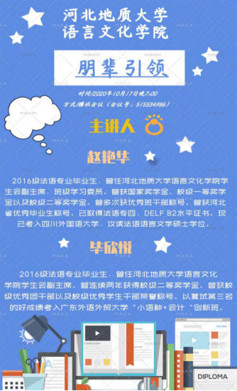 语言文化学院于2020年10月17日、18日两天晚上19:00通过腾讯会议平台开展了“仰山慕水”新生培育计划系列活动之“朋辈引领计划”学习经验分享会,分为法语专场和英语专场。法语专场主讲人分别是2020届优秀毕业生代表毕欣悦及赵艳华,英语专场主讲人分别是2020届优秀毕业生代表杨曼琳、杨瑾怡。本次经验交流会主要面向大一学生,其目的是促进大一学生更快、更好地了解整个大学阶段,加快融入和适应大学生活,尽快投入到大学的学习中去。