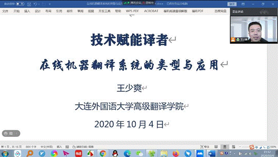为了进一步活跃学术气氛,帮助师生了解学术前沿知识,加深对机器翻译技术发展的认识,10月4日下午,语言文化学院邀请大连外国语大学王少爽博士作了题为“技术赋能译者:在线机器翻译的类型与应用 ”的在线学术讲座。讲座由学院科技管理负责人娄丽景主持,副院长安尚勇详细介绍了此次讲座的意义及作用。
