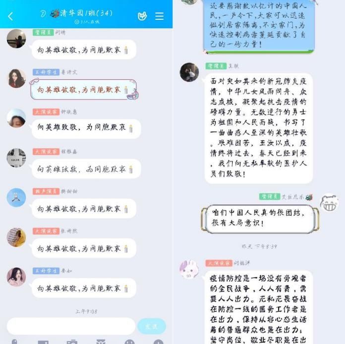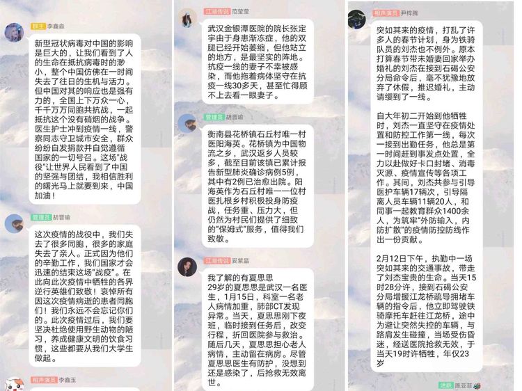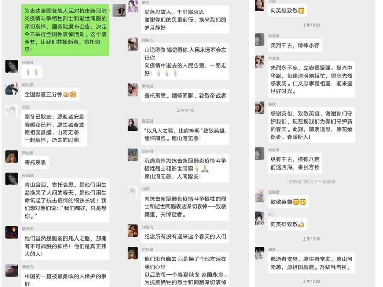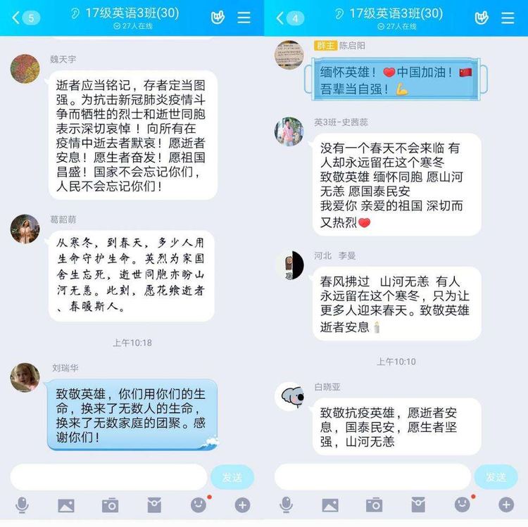默哀结束后,外国语学院2017级英语三班的同学们纷纷通过班级QQ群表达自己此时所想。一些同学表达了自己对英雄的哀悼,胡文媚同学说:“瑞雪未必是丰年,大雪是无痕。国难当头匹夫有责,你们用生命守护了我们。此刻我们铭记英雄,缅怀同胞。愿不要遗忘此时此地的一切。感恩所有付出这一切的你们。”陈利双同学说:“在这场没有硝烟的战役中,你们主动请缨,不计报酬,无论生死。你们的精神深深地感动了我,你们在这重压之下,毅然前行,展现了炎黄子孙的坚强风骨。你们用自己的牺牲换来了中国人民的平安,你们是我们的楷模,时代的英雄!向你们致敬!”苏皓静同学说:“从来都没有什么岁月静好,只不过有人替你负重前行。谢君踏平山前泞,愿君散作漫天樱。愿逝者安息。幸得有你,山河无恙。致敬每一位英雄。”一些同学表达了自己对这次公祭活动的看法,李纹纹同学说:“对于许多人来说,这个清明,无关树底清风、明月万里的风月吟诵,也无“梨花风起正清明,游子寻春半出城”的踏青兴致。因为,于国于家,总有一些生离死别的人和事,值得铭记,这是尊重生命与敬畏历史的不绝之流。”王锟同学说“不语的时候,更适合铭记。我们将铭记冲锋在前的逆行者,我们将铭记献身人民和祖国的牺牲者,我们将铭记血脉相连的逝去者。神州无恙,处之我幸;怀月抱星,跃马前行。”群里一句句发言流露出的真挚的情感感染着每一位同学,活动结束后同学们纷纷表示经过讨论自己对生命意义的感悟,对国家的感情又有了新的认识。讨论活动圆满结束。