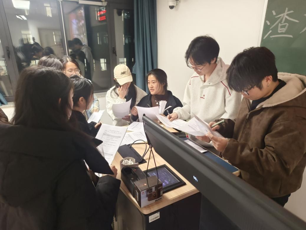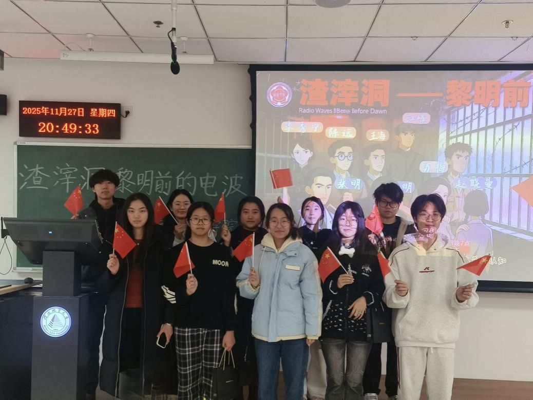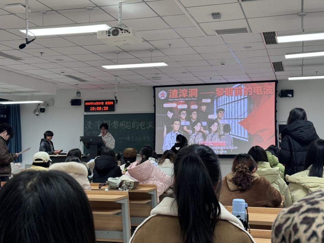 2025年11月27日晚7点,由语言文化学院学生党支部主办的沉浸式双语剧本杀活动《渣滓洞·黎明前的电波》在教一208教室顺利举行。本次活动融合历史教育、语言实践与沉浸式剧情体验,吸引了来自语言文化学院、宝石与材料学院、数理教学部、法政学院及艺术学院共75名学生参与,现场氛围庄重,反响热烈。