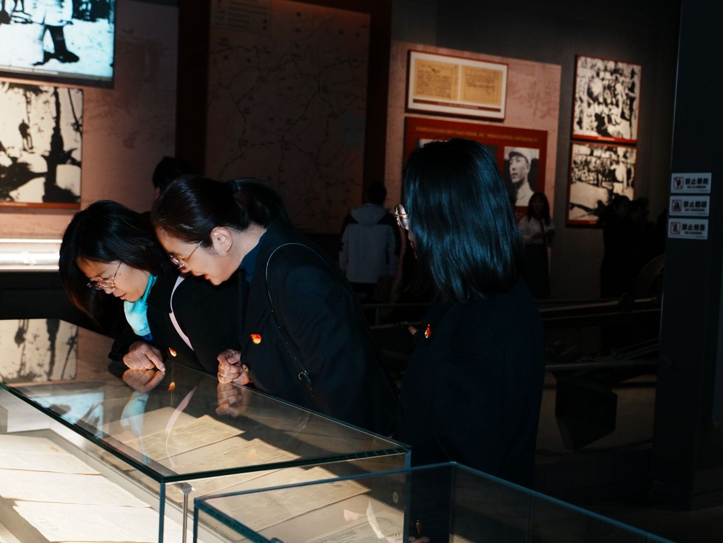 活动现场庄严肃穆,春风和煦中更显崇敬之情。全体人员首先参观“红色信物 不朽荣光”清明祭英烈文献展,45件珍贵实物文献静静陈列,从“解放元氏杀敌英雄”铜制奖章到《人民日报》原版战地报道,从战士攻占云盘山珍贵合影到各类革命文物,生动再现石家庄解放的壮烈历程。语言文化学院师生驻足凝视、认真聆听讲解,在历史信物与红色故事中感悟革命先烈舍生取义、为国捐躯的崇高精神,厚植爱党爱国爱社会主义情怀。