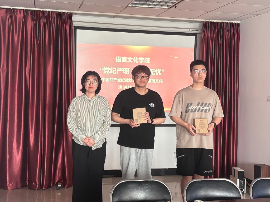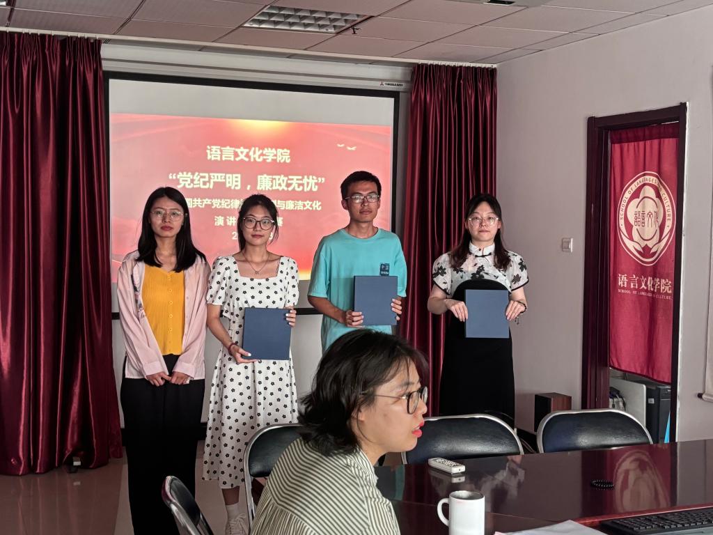 为了深入推进党纪学习教育,加强廉政文化建设,语言文化学院学生党支部举办了“党纪严明,廉政无忧”主题演讲比赛。决赛于5月23日在综合楼706举行,语言文化学院党委副书记杨旭辉、学生党支部书记姚秀云、副书记苗文芳担任评委。