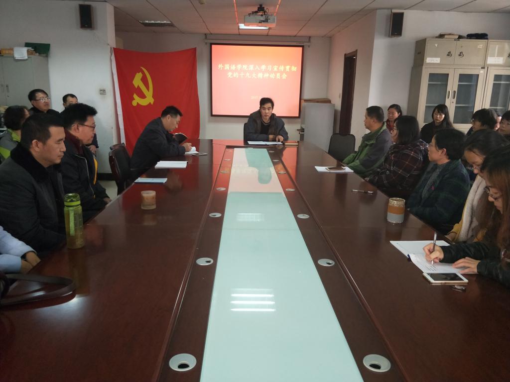 11月9日下午,外国语学院召开了学习贯彻党的十九大精神动员大会,王树明书记作思想动员并发表讲话,学院全体教师党员、学生党员参加会议。