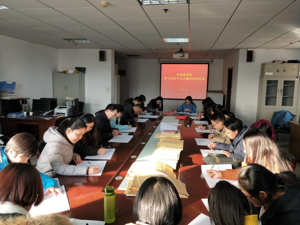 为学习贯彻落实好党的十九大精神,营造学习宣传十九大精神的浓厚氛围,外国语学院在全院师生中开展“学习十九大”知识竞赛活动。学院党总支在十九大精神学习工作动员会上,对“学习十九大”知识竞赛活动作了安排部署。