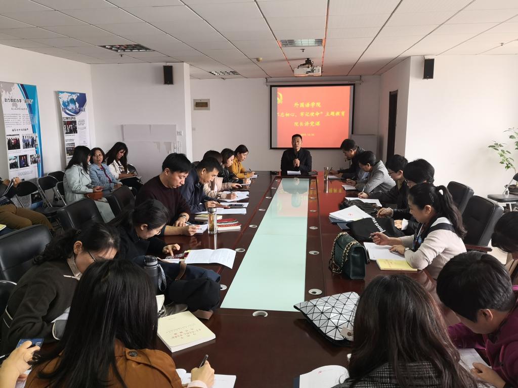 10月24日下午,外国语学院党总支在综合楼706召开全体教职工党员大会,开展“不忘初心、牢记使命”专题党课讲授活动。大会由王树明书记主持,付天军院长作了题为《牢记初心使命、勇于担当作为》的专题党课。