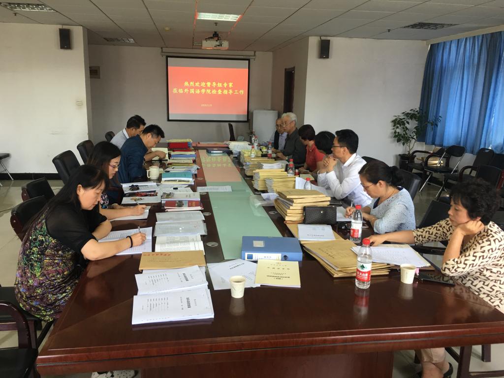 教务处处长李文斌教授主持检查工作会议,他首先阐明了本次检查工作的重要意义、检查的基本流程、检查工作的重点项目等。然后,付天军副院长从学院基本情况、本学期重点工作、学院审核评估工作重要意义的认识、迎评工作举措、评估材料的搜集与整理情况及存在的问题与策略五个方面向与会督导专家做详细汇报。他指出,外国语学院党政领导班子和全体教职员工非常重视期中教学质量检查及本科教学审核评估工作。外国语学院“迎评”工作的重要举措包括:抓关键少数,领导做表率;扎实做好日常工作,从师生的思想观念入手,加强制度建设,以教师发展促进教学水平的提升及人才培养质量的提高;同时,我院注重营造氛围,优化环境;注重办学特色凝练,促进全面发展。汇报工作后,督导组专家对照审核评估6+1项目清单上支撑材料的准备情况进行了全面检查。