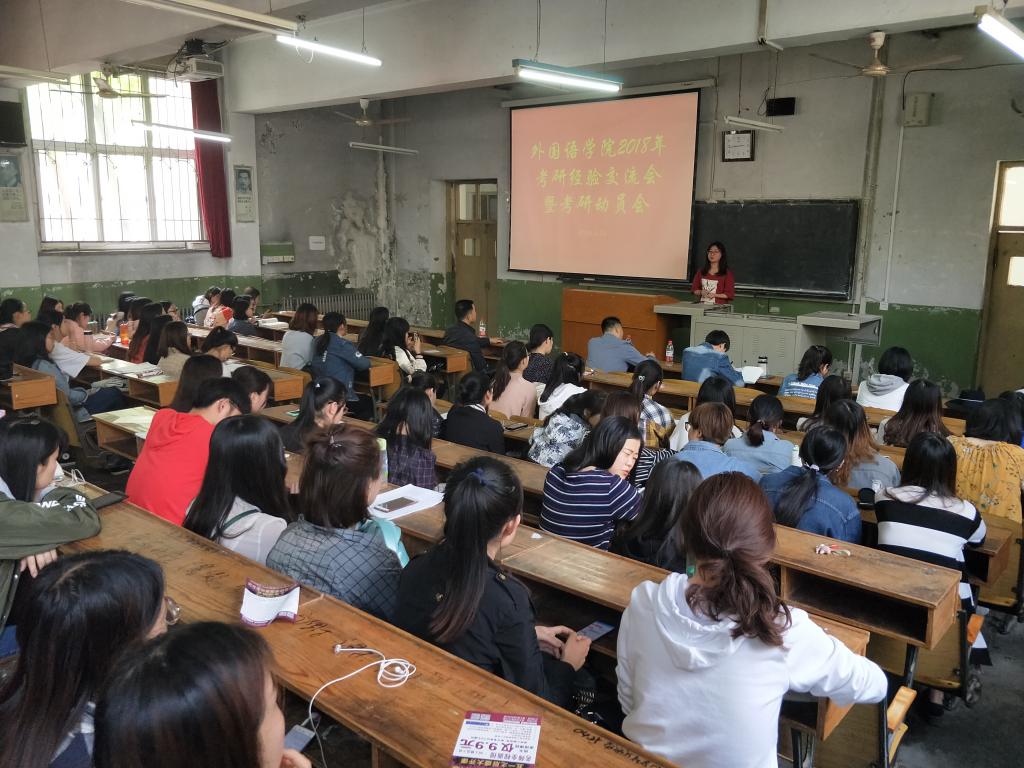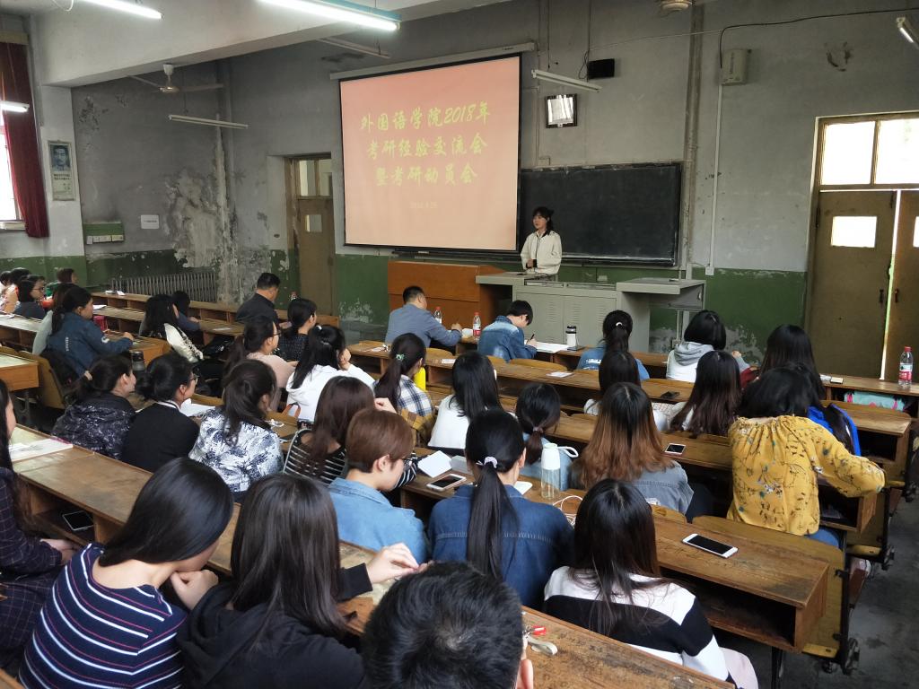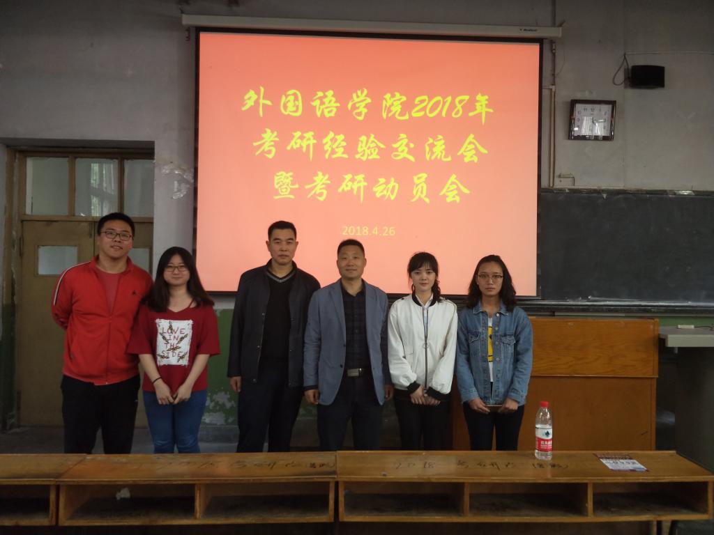 4月26日,外国语学院组织召开的“2018年考研经验交流会暨考研动员会”我院二、三年级全体同学参见了会议。外国语学院党总支书记王树明老师,主持工作的副院长付天军教授全程参加了会议。会议由辅导员杨旭辉老师主持。