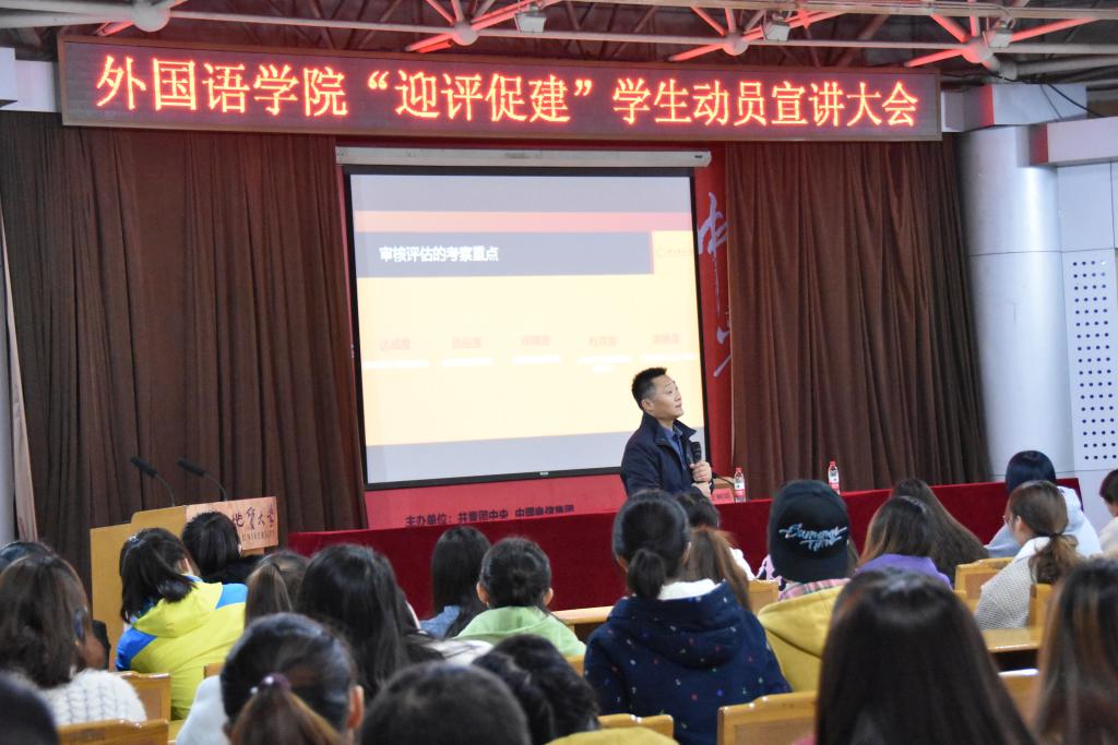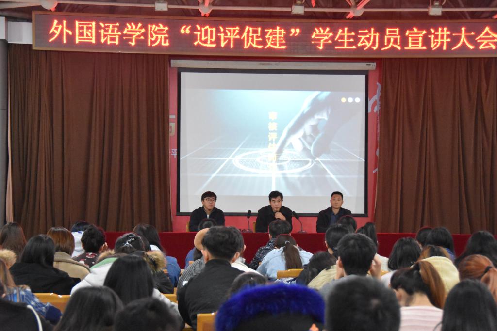 为认真做好教育部本科教学审核评估各项准备工作,11月18日下午16点我院在科技报告厅举办了外国语学院“迎评促建”学生动员宣讲大会。出席本次会议的有外国语学院党总支书记王树明,副院长付天军,团委书记杨旭辉及大二、大三、大四全体学生。