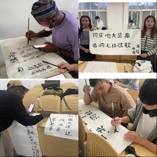 活动中,留学生们认真进行了书法创作,把抽象的思想情感诉诸笔端,借书法的形式表达了对河北地质大学七十周年华诞的祝福,尽管他们的字略显生涩,却充满了对地大和中国文化的热爱。留学生梅卡和宋岩兴奋地表示:“我很荣幸能够参加本次活动,利用书法的形式来更深入地了解地大的文化和历史!”