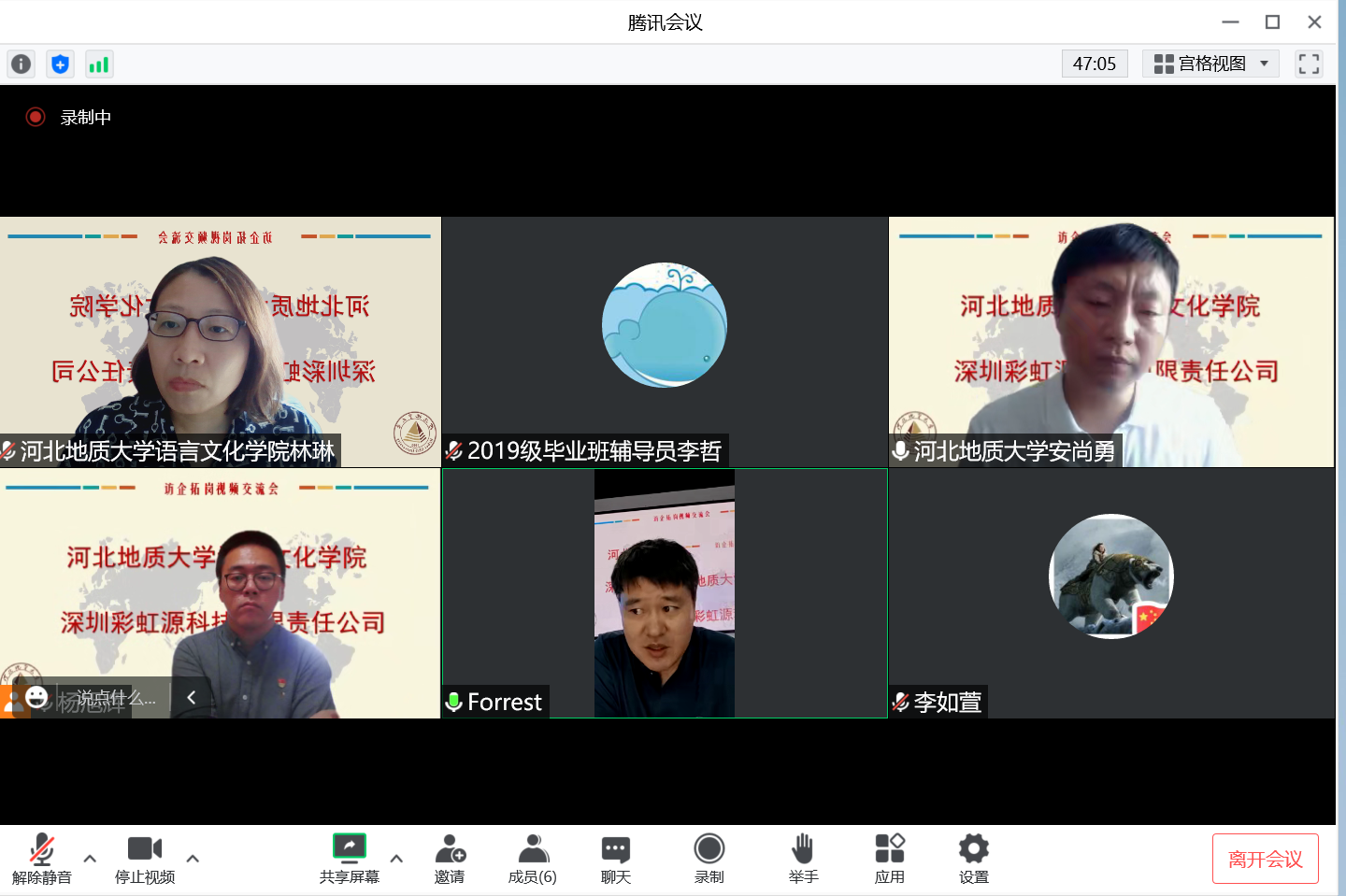 为拓展毕业生就业市场和学生实习岗位,语言文化学院领导班子继续积极开展“访企拓岗促就业”活动。2022年9月2日下午2:00,语言文化学院与深圳彩虹源科技有限公司在线上座谈,就在学生实习、就业等方面开展合作进行了商谈。学院党委书记林琳、党委副书记杨旭辉、副院长安尚勇、毕业年级辅导员李哲,彩虹源科技有限公司总经理、我校2005级英语专业校友霍景金参加座谈。杨旭辉主持了座谈会。